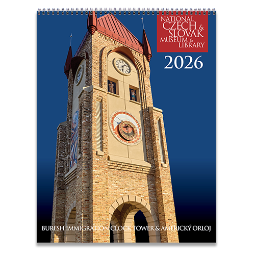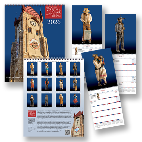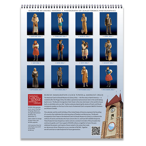 In 2026, National Czech & Slovak Museum & Library is excited to join the celebration of the 250th anniversary of the founding of America with a calendar that pays homage to immigrants who contributed building this country. To do that, we are using the portraits of the Czech and Slovak immigrants (figurines) featured in our Prague-style astronomical clock (orloj), the only one of that kind on the American continent.