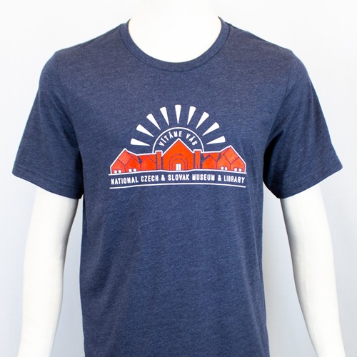Vítáme Vás! This heather blue t-shirt featuring our beautiful building is available in adult sizes small – 3XL, poly/cotton blend.