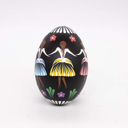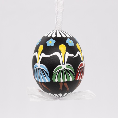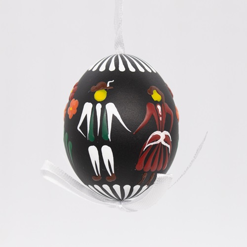 Pottery making with over 600-year tradition and that ceased several decades ago, continues in the art of Easter eggs decorating. The pattern of this tradition is called after Pozdišovce village located in Eastern Slovakia (pozdišovská keramika). The signature designs with simple geometrics, natural motifs and even karička (girls and boys dancing in circle) on the typical black background make them stand out. Pin wax decor on hollowed real goose and chicken egg sizes. Chicken eggs come with or without a ribbon loop.